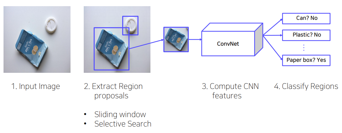 - sliding window방식은 무수히 많은 영역이 추출되고 거의 다 배경으로써 의미가 없는 영역이기때문에 RCNN에서는 사용되지 않음
