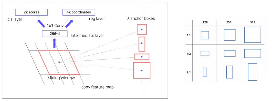 이미지가 conv를 통과해서 featuremap이 나오게 되고 각 피쳐맵의 각 셀마다 다양한 스케일과 비율을 가진 k개의 anchor box가 나오게된다