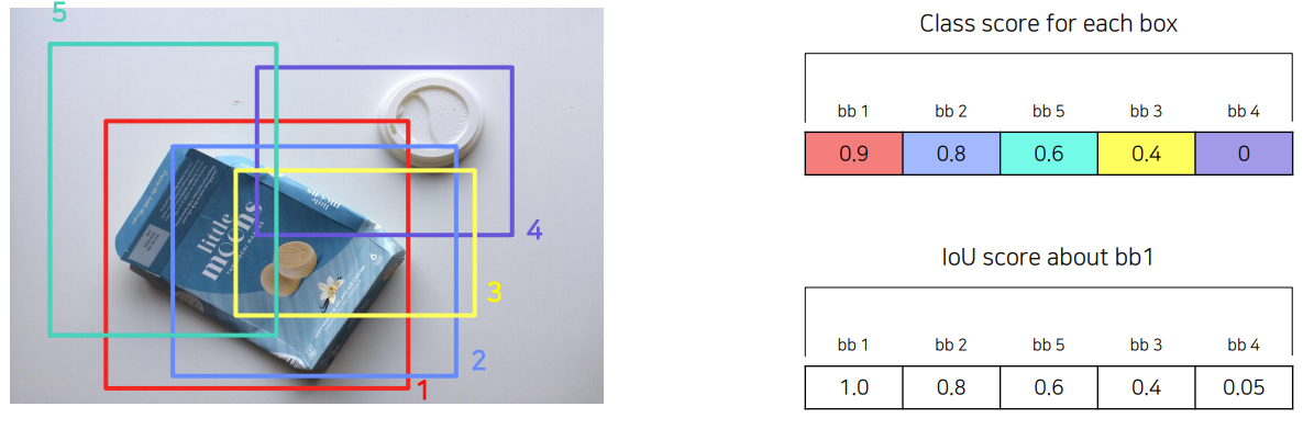 - bb1과 bb2의 IoU를 계산해보면 0.7이상인 0.8이 나온다 그러므로 같은 객체라고 취급하여 bb2를 0으로 변경