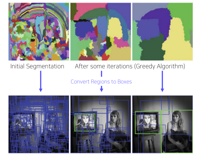 - 이미지에 존재하는 특성(shape)들을 추출해서 영역을 만들고 무수히 많이 만들어진 영역들을 통합하면서 줄여나간다