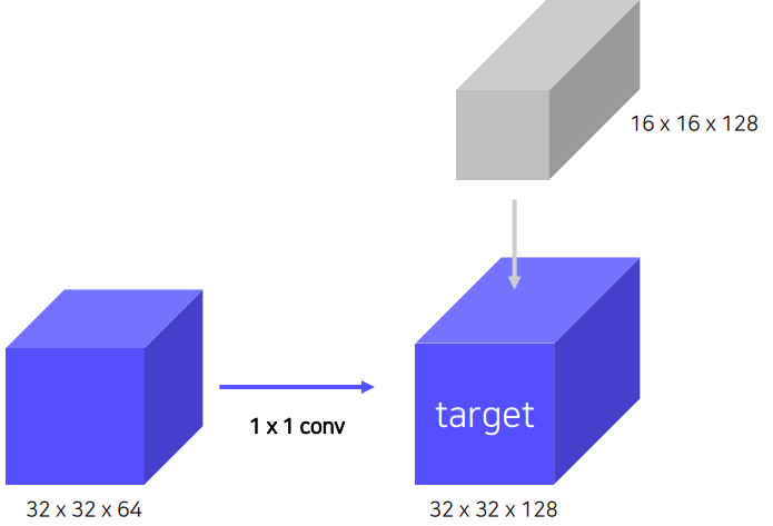 그래서 Bottom-up과정에서 나온 feature map은 1x1 conv를 해서 channel size를 늘려준다