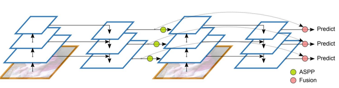 하나의 featuremap에서 pooling을 진행할때 diliation rate을 변화해가며 receptive field를 키워나가며 pooling한다