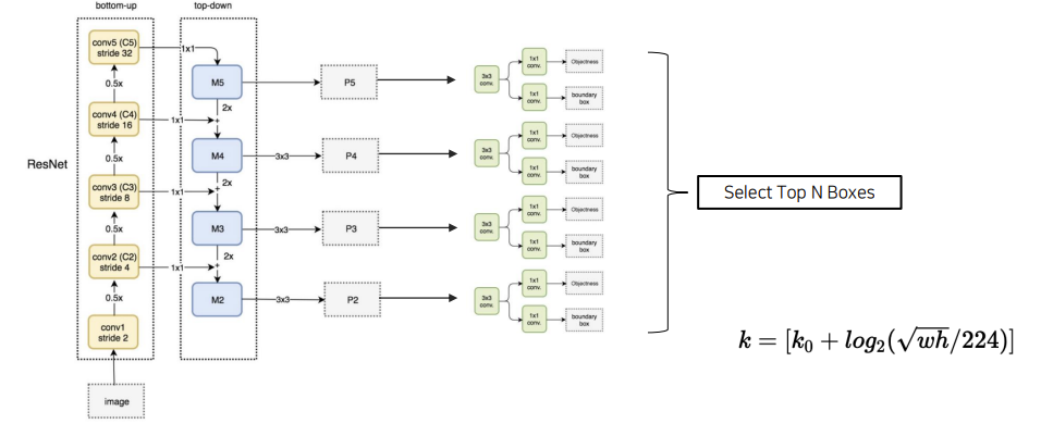 Faster Rcnn같은 경우에는 싱글 스테이지라서 RoI가 어느 stage의 featuremap에서 나온지 알 수 있지만 FPN은 Input stage가 4개가 있어서 P5,P4,P3,P2 중 어디에서 나왔는지 알 수 없다