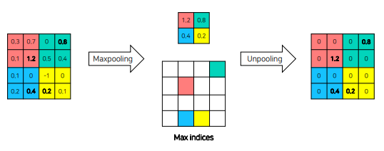 Unpooling은 maxpooling의 핵심이되는 값의 위치 정보를 같이 들고 pooling한다