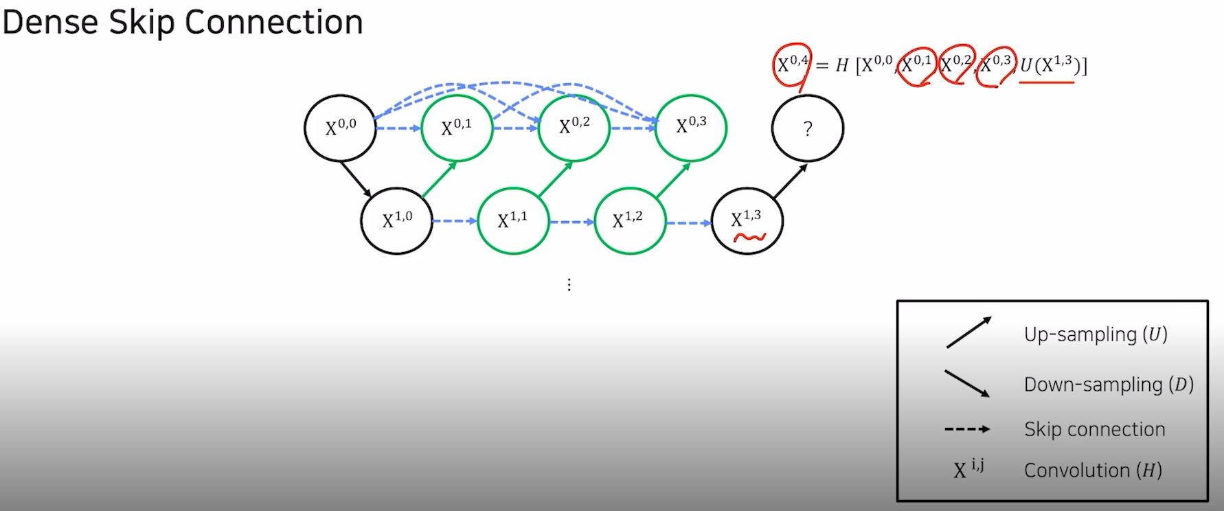 - skip connection을 기존에는 같은 레벨에있는 X0,0만 사용했지만, 여기서는 앞선 모든 부분을 활용한다