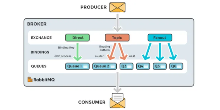 - Topic Exchange: Routing Key와 Binding Key 사이에 와일드카드 매칭을 허용하여 메시지를 라우팅합니다.
