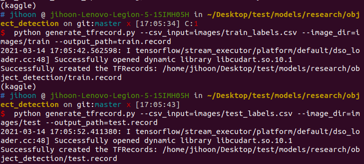 잘 실행이 되었다면 object_detection폴더에 train.record, test.record 파일들이 생성됩니다.