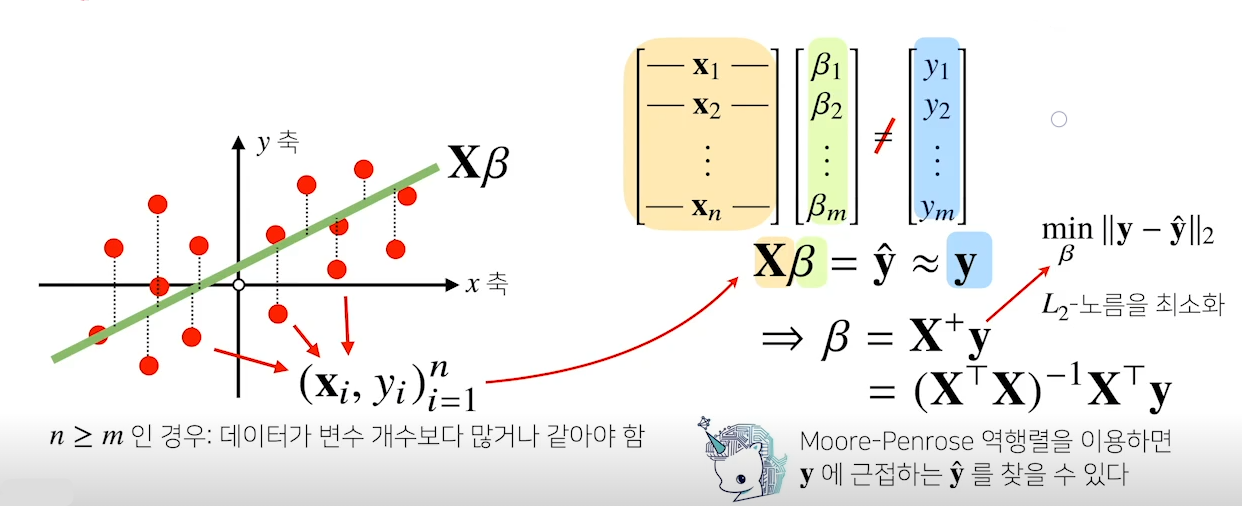 (이미지 출처: boostcourse AI Tech Precourse) - sklearn의 LinearRegression과 Moore-Penrose로 구한 역행렬(베타)의 값이 동일