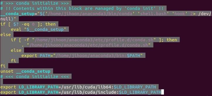 저는 zsh설치 후 우분투에서 anaconda랑 cuda path를 지정해줘야했으므로 저의 사례를 예로 들겠습니다.