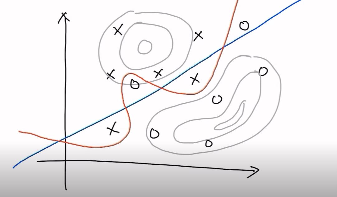 - 파란선처럼 경계가 되어야 하지만 주어진 데이터를 가장 잘 설명하는 확률 분포 함수를 찾다보니 빨간선(Overfitting)처럼 그어짐