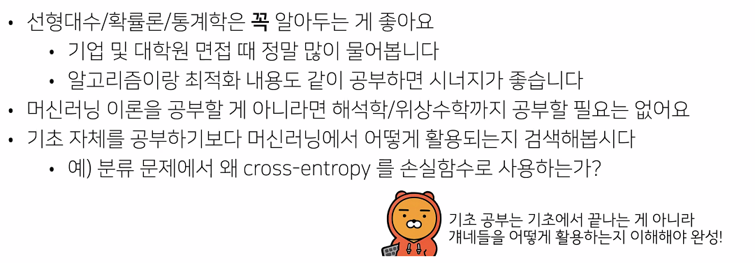 - 영어공부도 가능. 벡터와 행렬부터 공부해도 좋음, Calculus도 다룸, python 실습 ⇒ '구현능력 향상에 좋음'