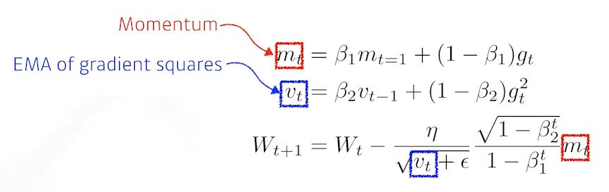 - Gradient 크기가 변함에 따라서 Adapted하게 learning rate을 바꾸는것과 이전의 gradient에 해당하는 momentum정보를 합쳐서 사용
