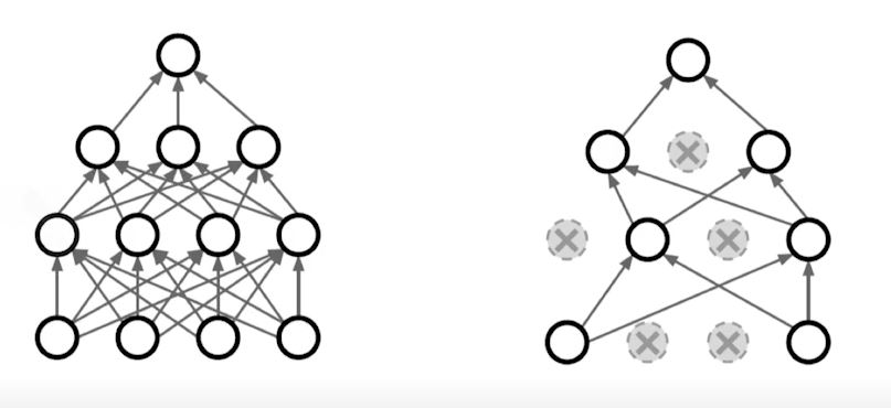 - neural network의 레이어마다 일정 개수의 w를 0으로 바꿔줌