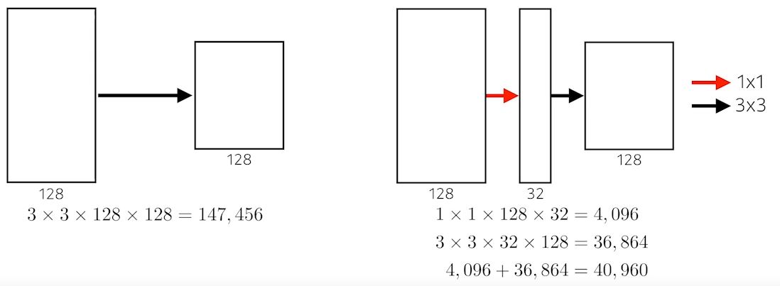 - 채널방향으로 dimension reduction이 들어감으로 인해서 전체적인 parameter를 줄이고 Input과 Output을 같게만든다.