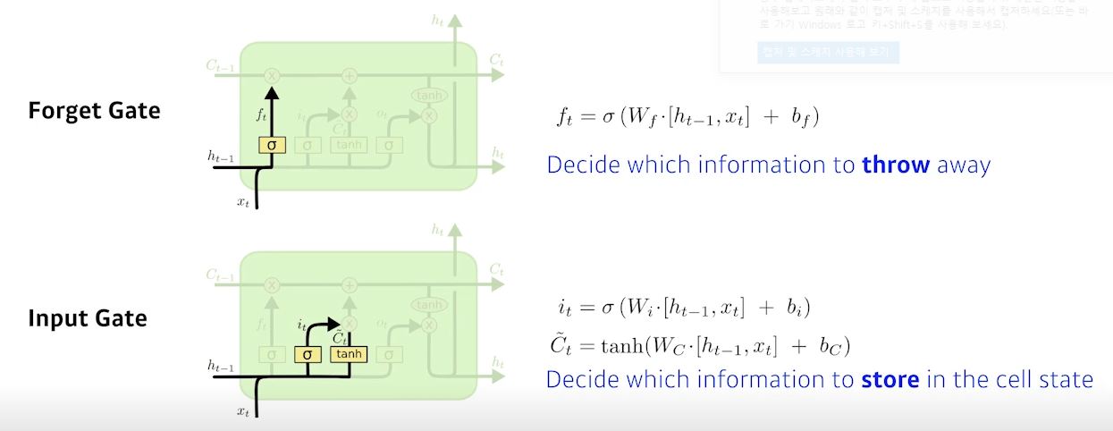 - Forget Gate: 어떤정보를 버릴지 어떤것을 살릴지 정하는 Gate