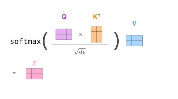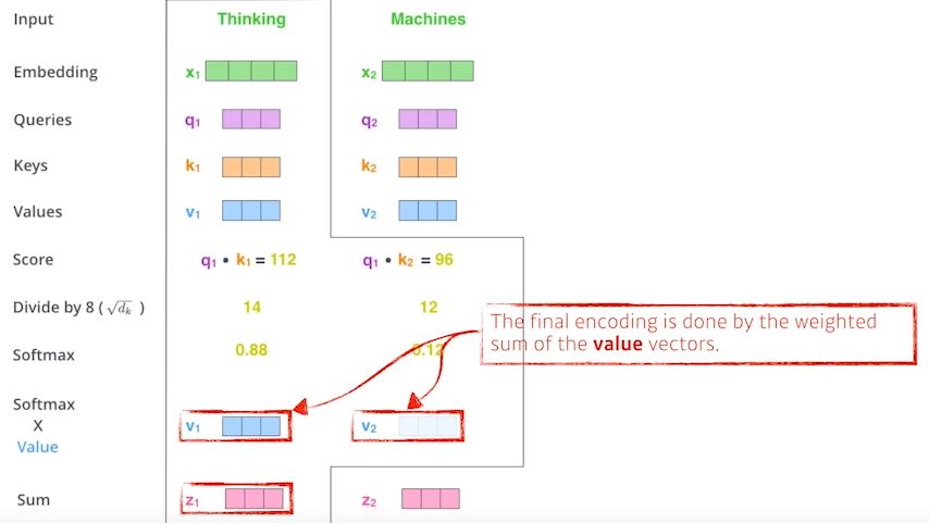 embeding 벡터가 주어지면 각각의 임베딩 벡터마다 Q,K,V vector를 만들고 Q벡터와 k벡터의 내적으로 score scalar를 만들고 softmax를 취해서 어떠한 벡터를 만든다.