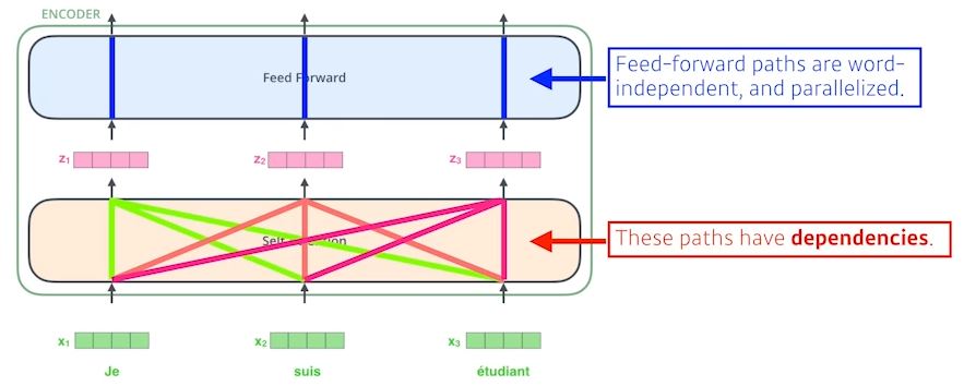 A단어 x_1이 self attention을 거쳐서 z_1으로 갈 때 x_2, x_3 정보를 다 사용한다 - 모든 Input 정보를 다 사용