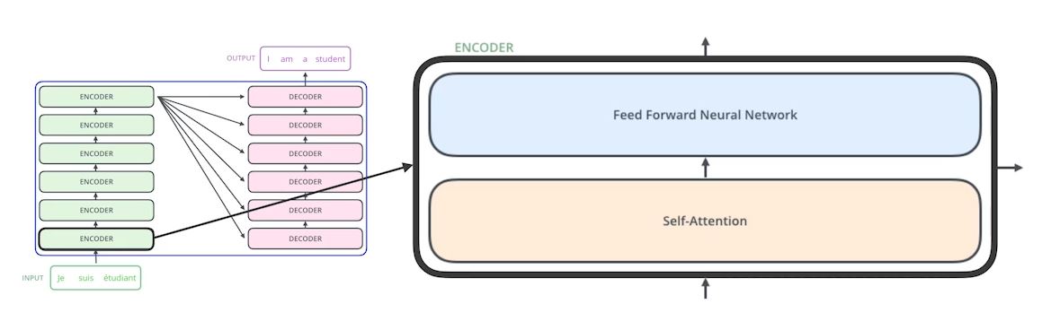 encoder는 self attention와 feed forward neural netwrok로 구성되어있다.