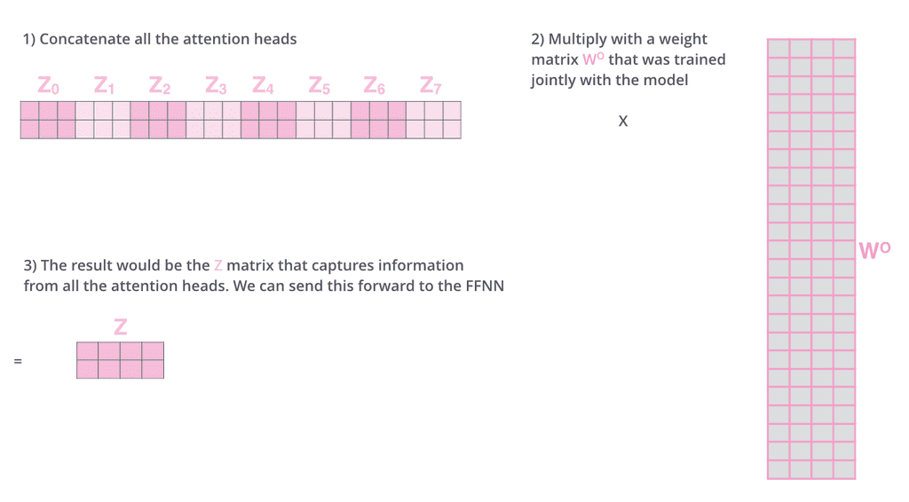- 하지만 MHA의 출력벡터는 concatenate 되어있기 때문에 기존의 입력값에 비해 n배의 채원이 되었으므로 이를 W0 와의 행렬곱을 통해 기존크기로 변환시킨다
