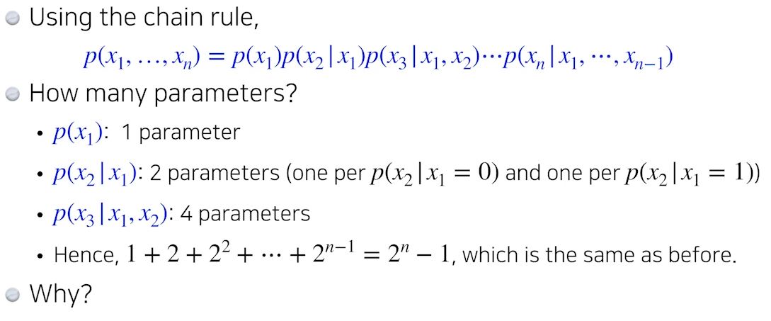 이 때 possible state는 2**n 이고, 필요한 파라미터 수는 n개다. 왜냐하면 각각의 parameter에 대해 px한개만 있으면되기 때문