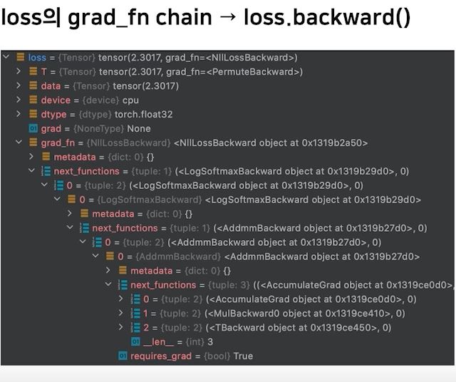 - 즉 input부터 시작한 모델의 forward함수와 criterion의 loss함수가 합쳐질 수 있어서 chain으로 연결되어있다.