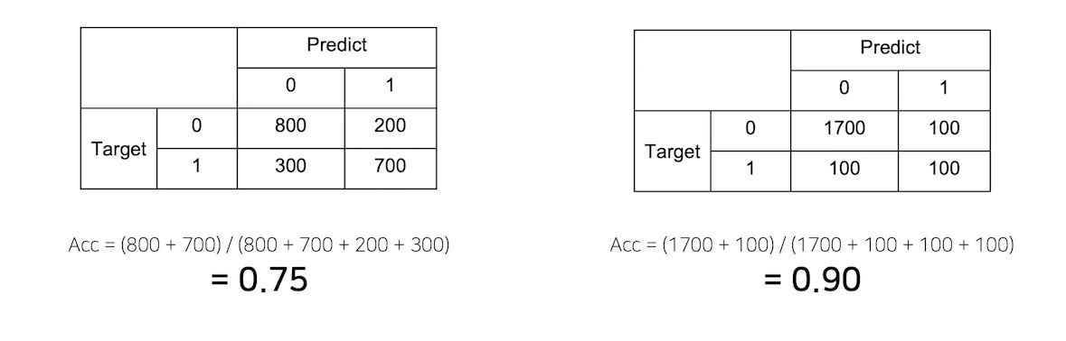 왼쪽은 정말 75%라고 생각할 수 있지만 오른쪽 모델은 2000개중 정말 1800개를 맞춰서 90%는 맞지만 다 0으로 찍으면...?