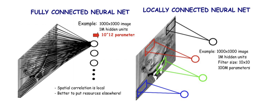 - FC는 pixel by pixel로 parameter가 필요하지만 CNN은 Locally 즉 조금의 영역만큼씩 추출해서 그 영역들의 수만큼만 parameter가 필요하기 때문에 사용되는 parameter가 많이 줄어든다.