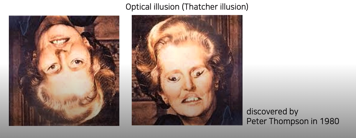 - 우리가 뒤집어져있는 사람의 사진을 본 경우가 많지 않기때문에 우리의 시각 기능이 일반 정면 얼굴 사진에대해 편향되어있다고 예측해볼 수 있다