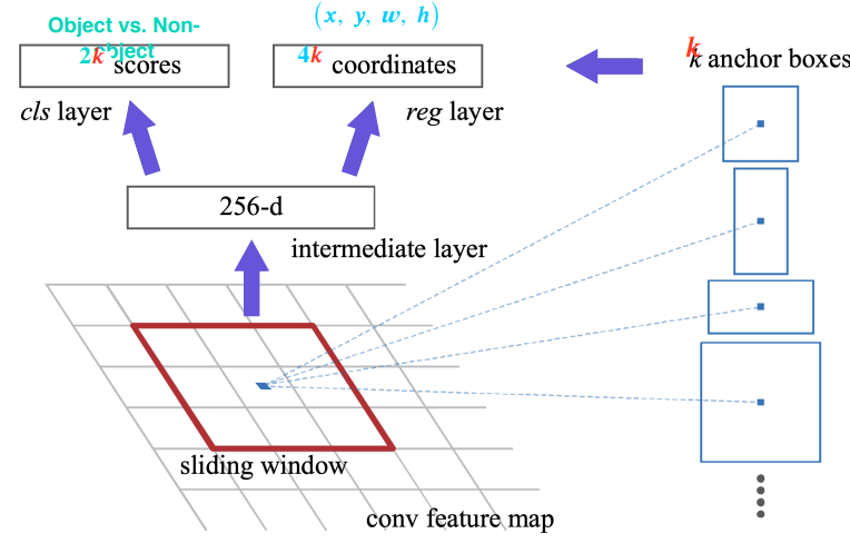 - 각 위치에서 256디멘젼의 feature 벡터를 추출하고 Object인지 아닌지를 나타내는 2k개의 classification score 미리 판별한다.