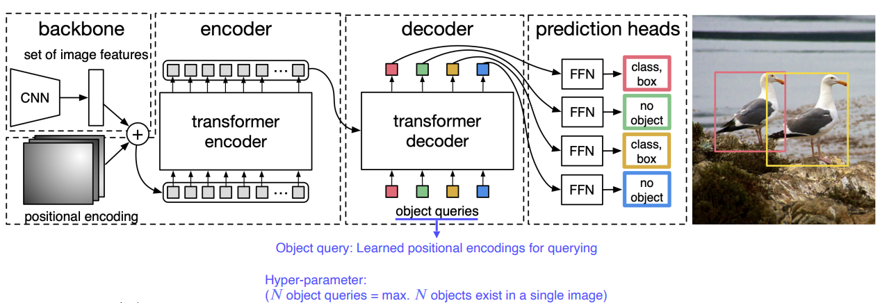 - 한개의 이미지에서 N개의 object가 발생할 수 있다는 것을 미리 정해두고 쿼리를 물어본다