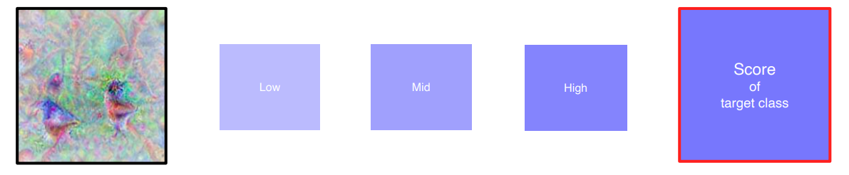 - 랜덤한 이미지를 마구 넣으면 클래스 스코어가 낮게 나올텐데 이 값이 높게나오는 I를 찾는과정